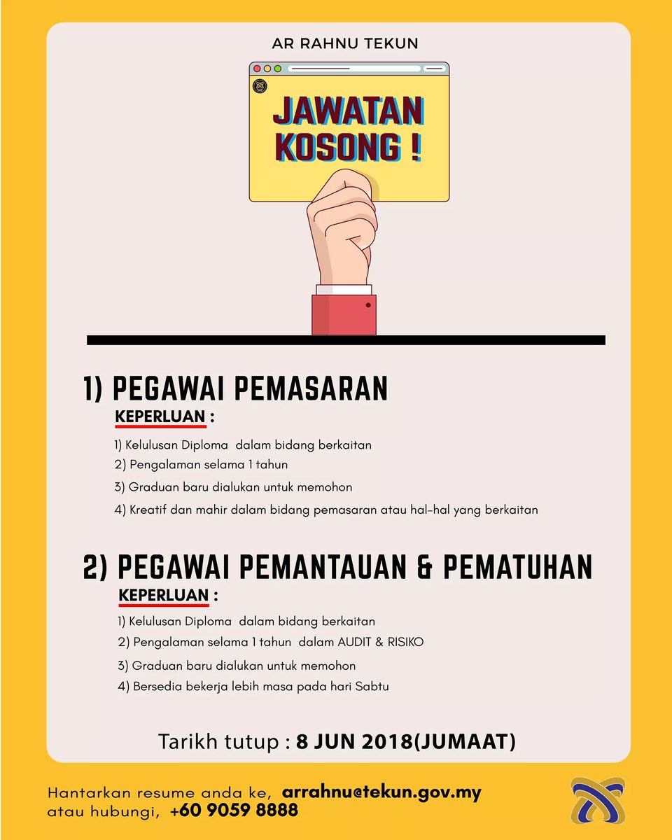 Becoming a member of this enterprise makes a people able to carry out the purpose simpler in supplementary to help the current. Jawatan Kosong di Telekom Malaysia Berhad - 120 Kekosongan Elaun RM200000 Jawatan Kosong di Kolej Felcra. Ar Rahnu TEKUN mempelawa warganegara Malaysia yang layak untuk memohon jawatan sebagai penaksir dan anda boleh membuat permohonan dengan menghantar resume melalui email.